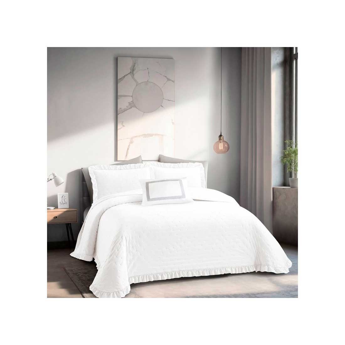 El volante decorativo marca la diferencia, aportando un aire romántico y acogedor que viste la cama con estilo sin esfuerzo.