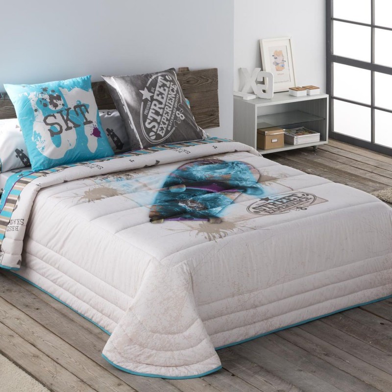Colcha juvenil con unos colores muy impactantes sobre fondo blanco y un gran monopatín como en el centro de la prenda. Un modelo fácil de combinar.