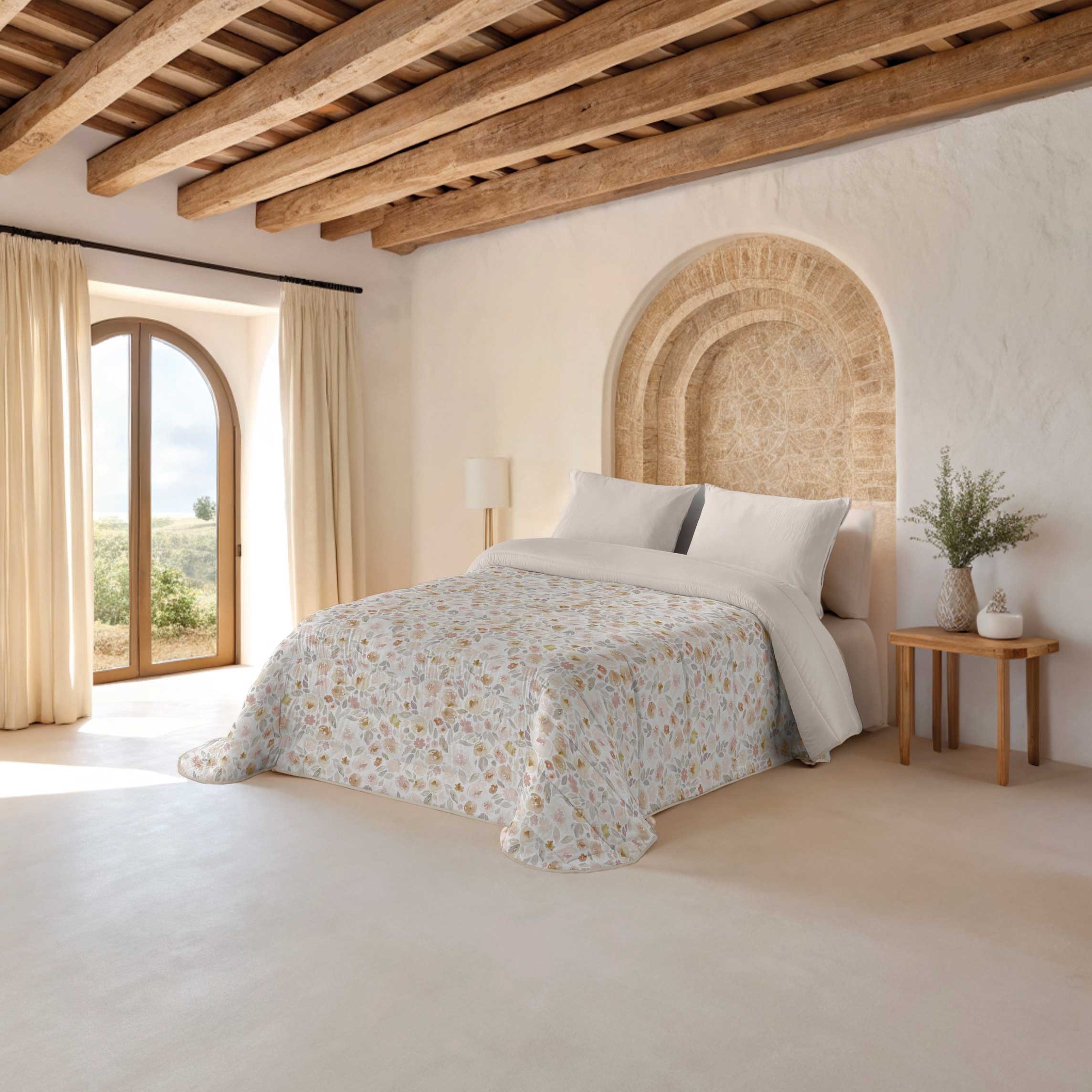 Edredón Clara con una delicada mezcla de flores y sutiles hojas en tonos empolvados, ideal para un dormitorio romántico, elegante y lleno de armonía.