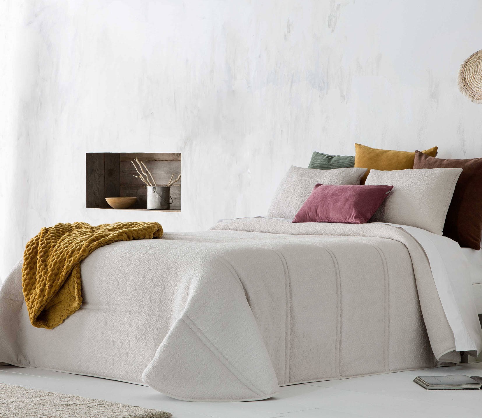 El modelo OSUNA liso con relieve que da mucho juego para lucir los cojines de decoración incluido de la medida 40x60.