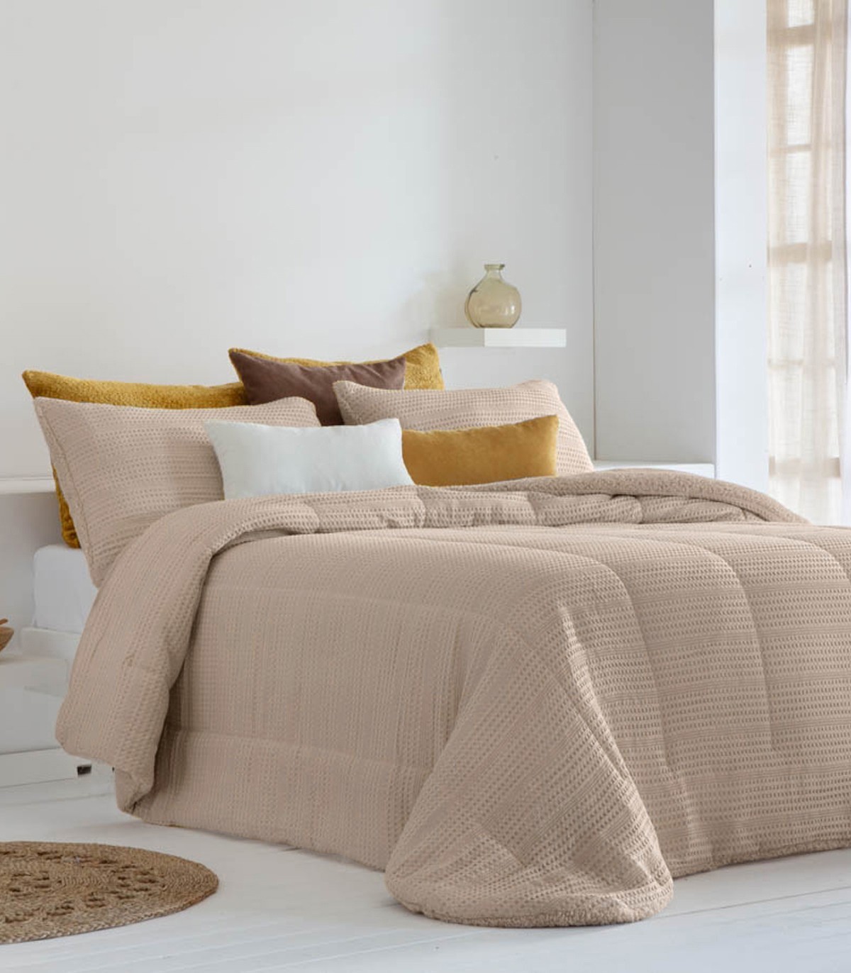 Su diseño en color liso con detalles sutiles en todo el edredón aporta un toque moderno que se adapta a cualquier estilo de dormitorio. Además, es reversible, mostrando por un lado la suave textura de borreguillo Sherpa, lo que te permite jugar con diferentes combinaciones decorativas y disfrutar de un dos en uno en tu habitación. Su tacto extra suave y calidez garantizan un descanso acogedor, y puedes combinarlo fácilmente con un plaid decorativo para darle un plus de estilo.