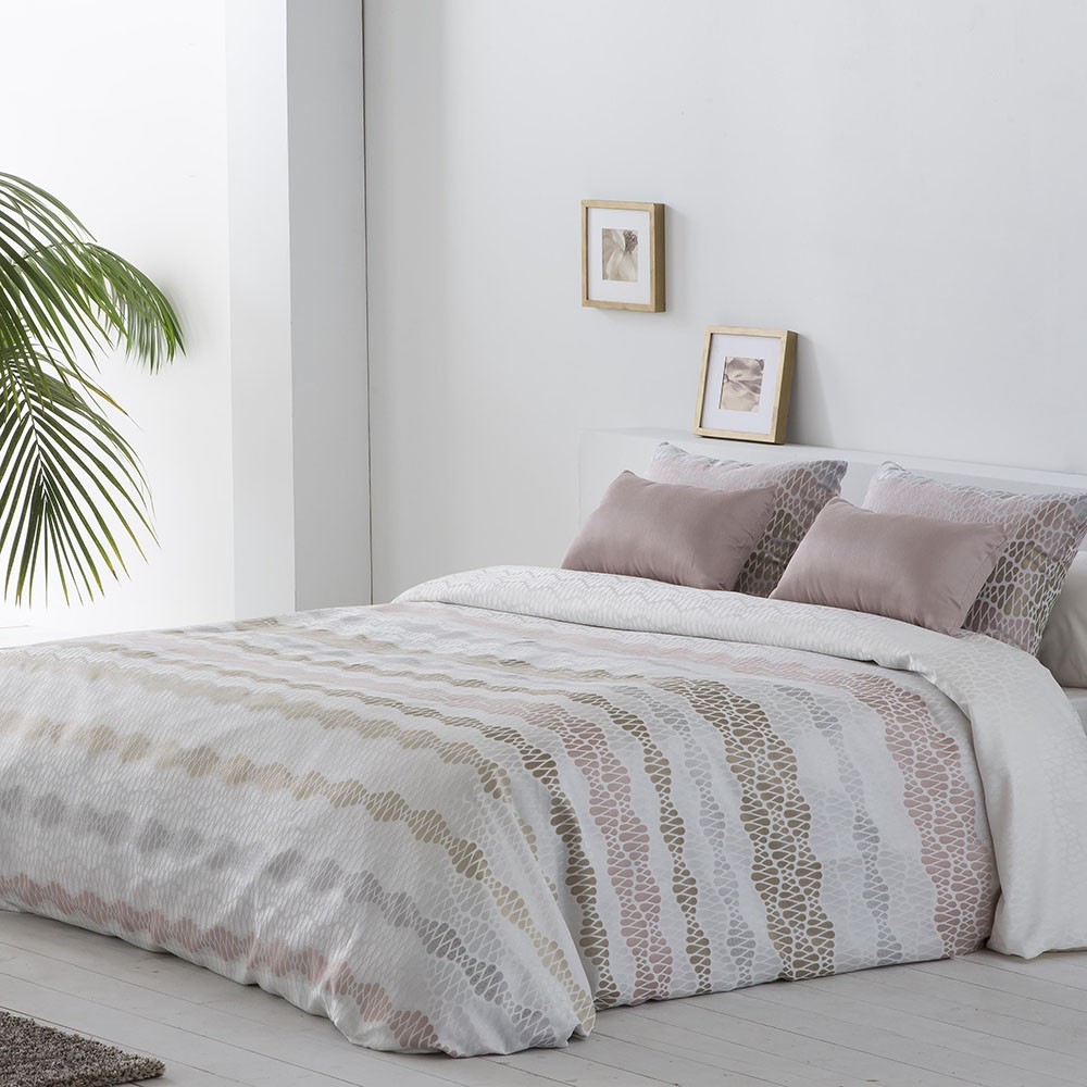 Impresionante modelo gotas de agua formando cenefas horizontales en tonos beige y nude para el modelo beige y azul empolvado y gris para el modelo gris. El acabado de la funda es abierto por los pies con un largo de 260.