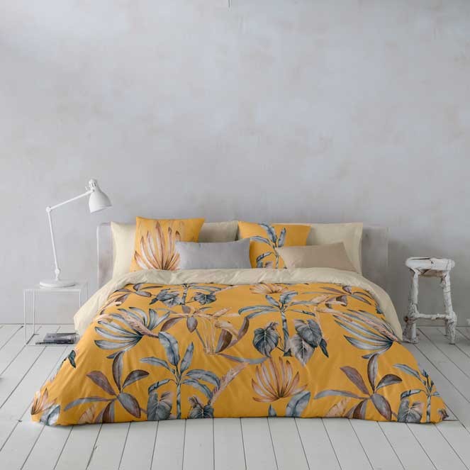 Funda nórdica con un diseño floral con fondo amarillento, combinación atrevida a la vez que elegante.