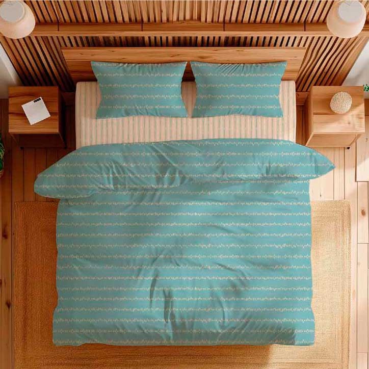 La encimera se presenta en un testampado azules . La bajera, ligeramente más clara, incorpora un estampado suave en tonos beige que aporta profundidad sin recargar el ambiente. El resultado es un conjunto armonioso y fácil de combinar.