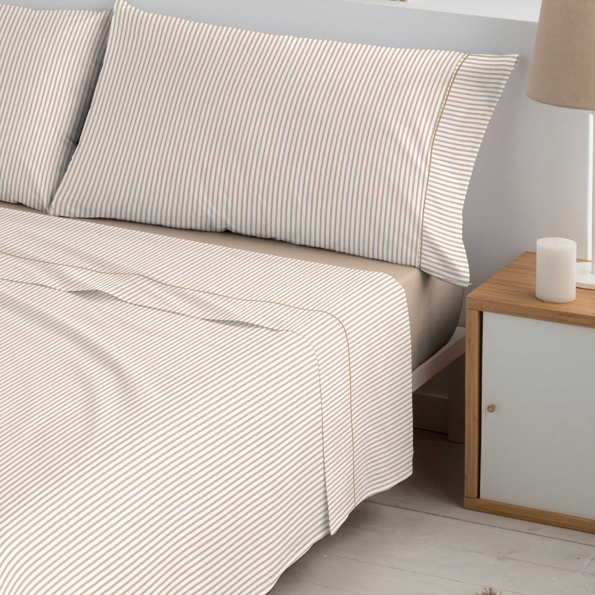 Descubre la suavidad y el confort que transforman cada noche en una experiencia única. Este juego de sábanas combina tejido de alta calidad con un diseño de finas rayas, aportando frescura, elegancia y un acabado impecable a tu dormitorio. Perfecto para primavera y verano, con bajera preparada para colchones de hasta 30 cm, asegurando un ajuste perfecto y un estilo cuidado.