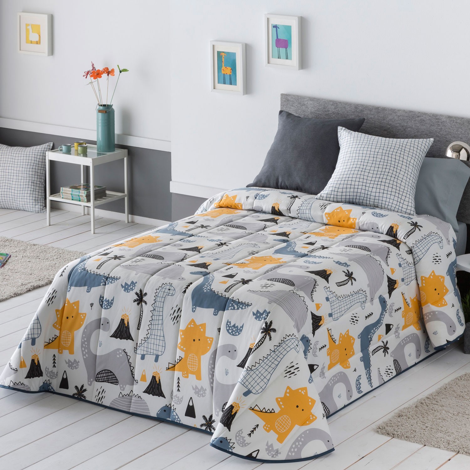 Estampado de dinosaurios de diferentes colores y tamaños sobre fondo blanco, consigue con esta prenda dar sensación de amplitud y mucha luz a la habitación de los más pequeños.