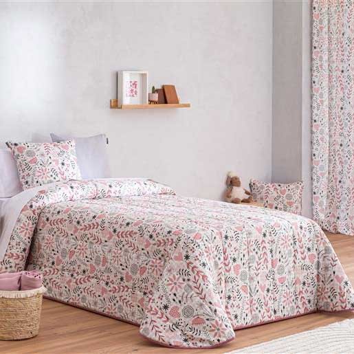 Colcha infantil con corazones rosas y motivos naturales, dulzura y encanto para su habitación.