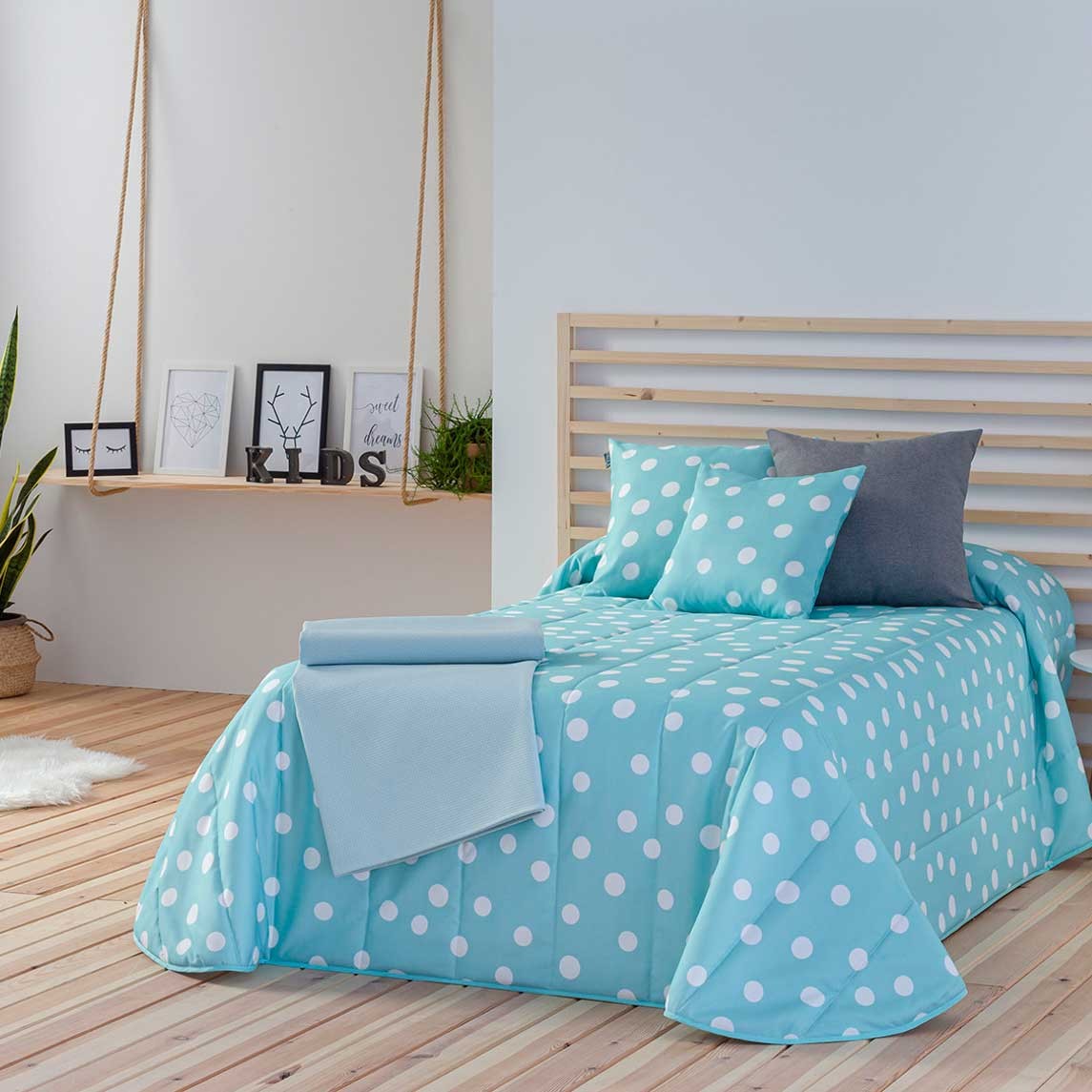 Llena tu habitación de frescura y alegría con esta colcha de fondo azul turquesa y lunares. Su diseño aporta un toque divertido y acogedor, ideal para renovar tu espacio con estilo y comodidad.