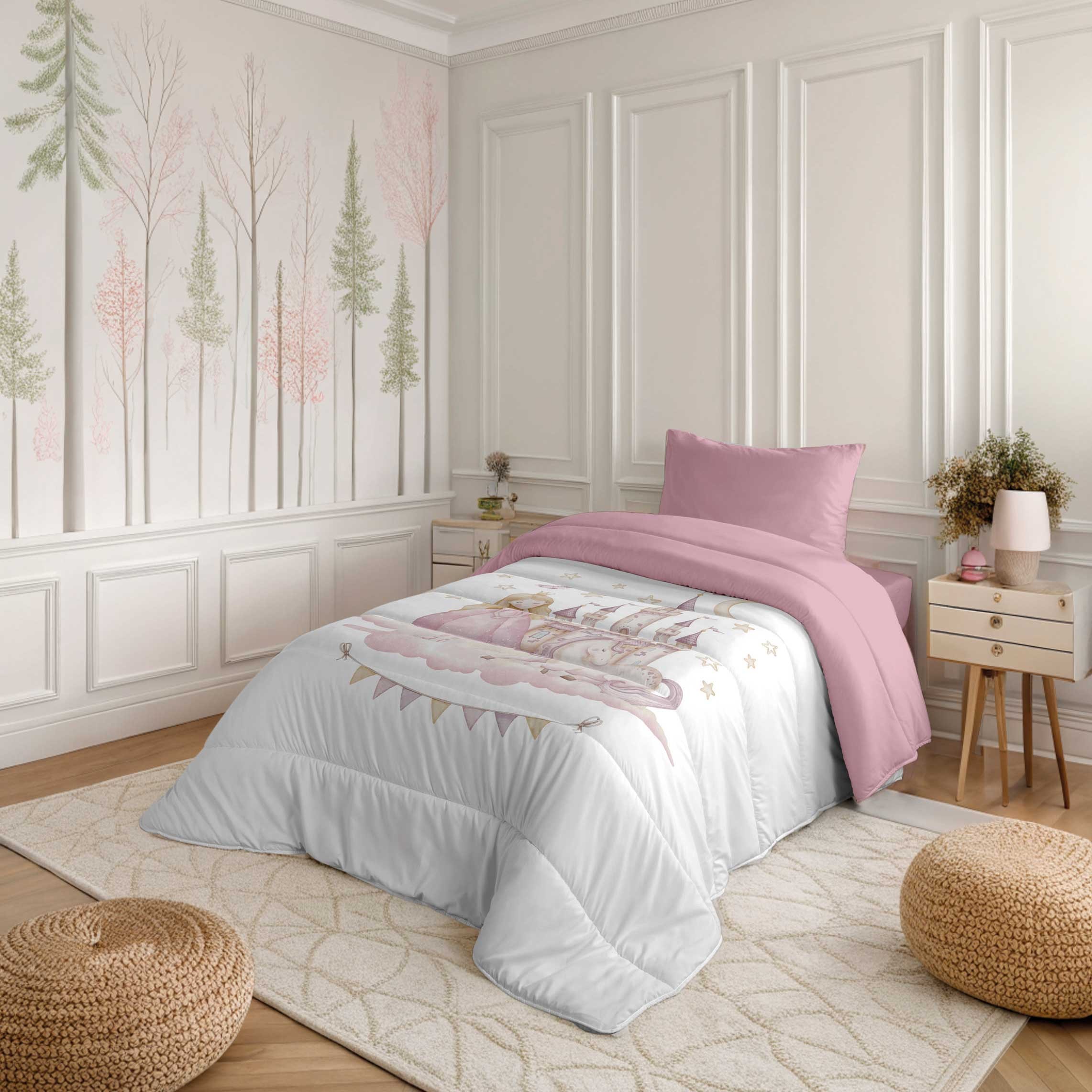 Edredón infantil con dibujo de princesa, castillo y unicornio en rosa sobre base blanca. Dulce, divertido y perfecto para un dormitorio lleno de fantasía y encanto.