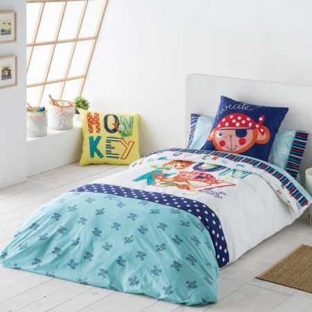 Divertido estampado para esta funda nórdica el mono pirata con combinación de azul y blanco un modelo que encantará a los peques de la casa. El acabado de la funda es abierto por los pies con un largo de 260.