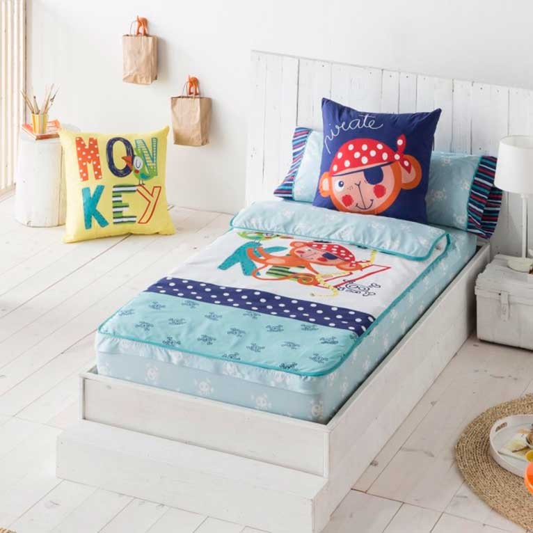 Modelo con estampado divertido un mono pirata en el centro con combinación de color azul y blanco que dará mucha luz a la habitación.